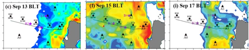Second, intensity matters. The right side of northern hemisphere tropical cyclones tend to be the strongest due to the added energy from their forward movement combined with their counterclockwise rotation. They detected this effect in the BL as well. On the right side of the typhoon, ocean cooling from mixing was reduced by 32% overall. On the left it was reduced by 15-19%.