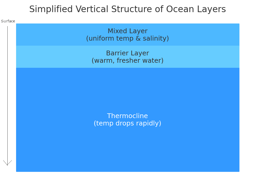 A BL forms when heavy rainfall or river runoff freshens the surface, making it less dense and more resistant to mixing with the cooler, saltier water underneath. It acts as a salinity-driven “floor” beneath the mixed layer. When the BL is thick (>~30m), it can help the ocean’s surface retain heat by limiting the upward mixing of cooler water from below. In a sense, it’s an insulating pad for the ocean’s surface.